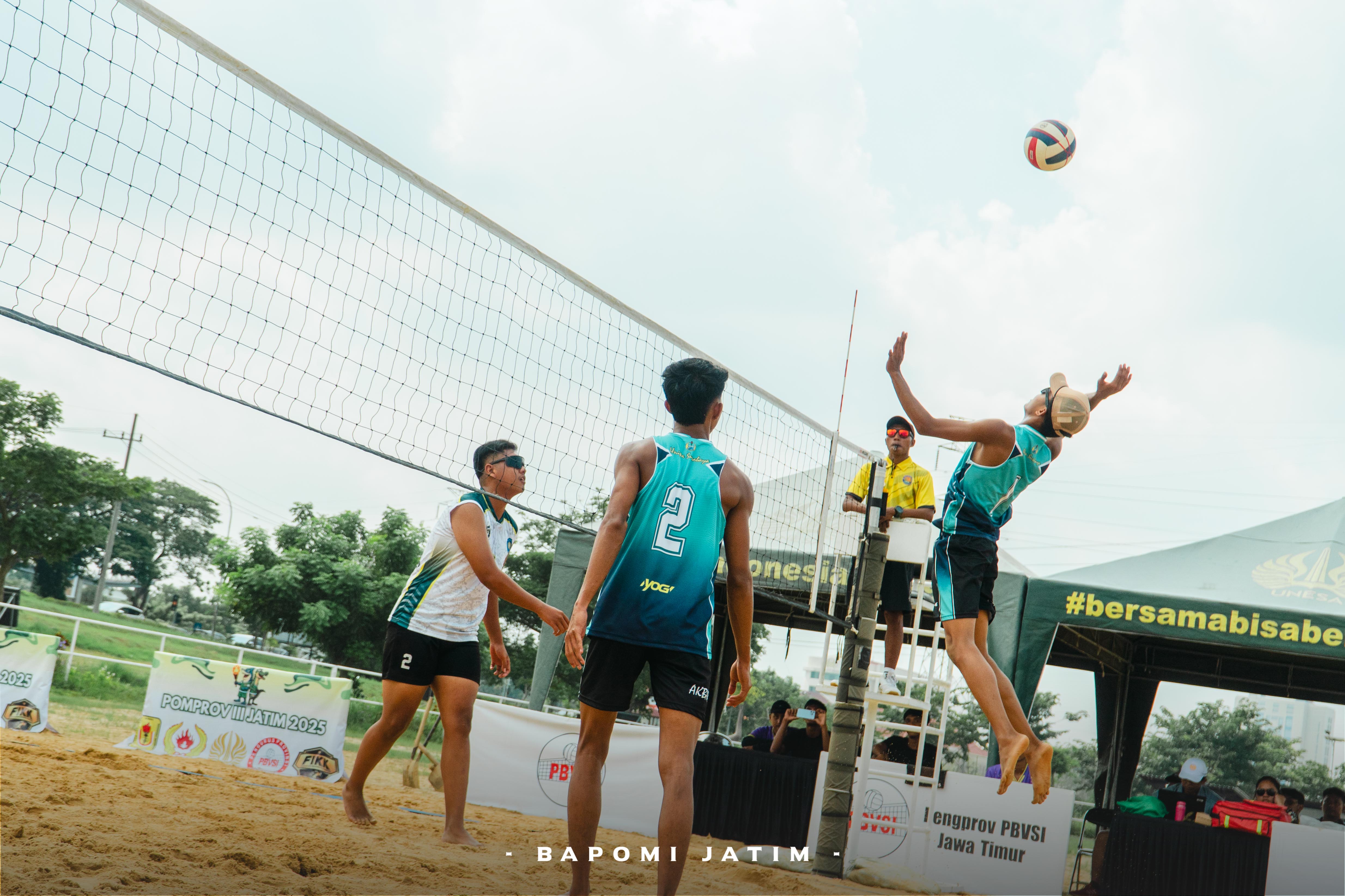 Bapomi.unesa.ac.id., SURABAYA—Pertandingan cabang olahraga voli pasir dalam ajang Pekan Olahraga Mahasiswa Provinsi (Pomprov) III Jawa Timur 2025 resmi digelar di Universitas Negeri Surabaya (Unesa) pada 29 Mei hingga 2 Juni 2025. Ko